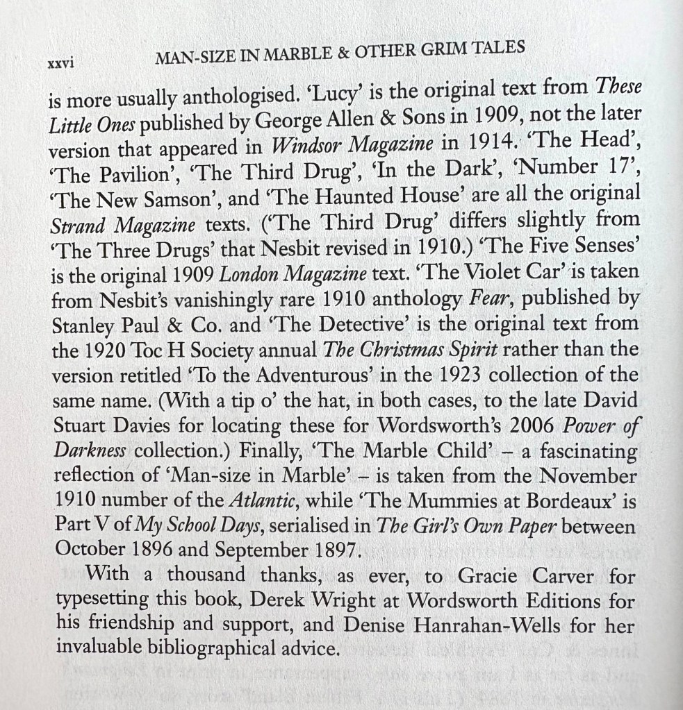 This excerpt comes from Nesbit’s short story ‘The Mystery of the Semi-Detached’ included in her 1893 collection Grim Tales. In just a few lines she moves from creating a vague sense of unease to a startling shock. To say this is characteristic of Nesbit’s gothic writing is an oversimplification as she wrote many and varied short stories which could be categorized under the umbrella of horror. Whilst there are distinct similarities regarding some aspects of style and thematics across her tales, there is also a rich variety and this sense of variety is exemplified by the newly published Wordsworth Edition Man-size in Marble and Other Grim Tales.